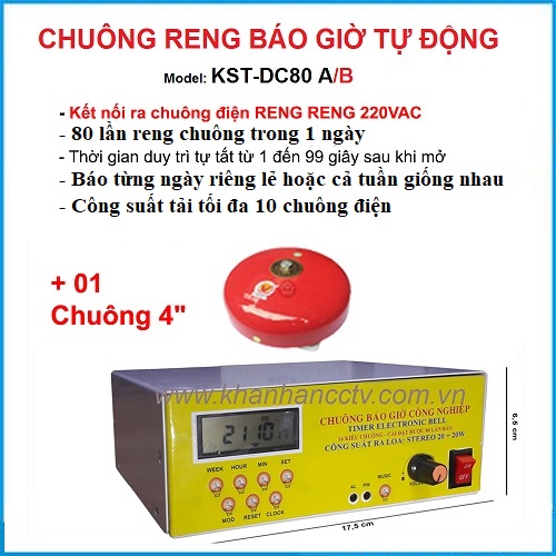 - Khánh An cam kết sẽ là Khánh An phân phối Bộ chuông reng báo giờ tự động 80 lần/ngày KST-DC80AB , cùng với chiều chính sách và chế độ hậu mãi tốt nhất.